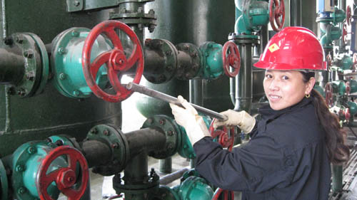 圖為北大荒米業(yè)二九O米廠水質(zhì)化驗(yàn)班長(zhǎng)王培英正在對(duì)新建的3兆瓦生物質(zhì)能熱電設(shè)備進(jìn)行檢修