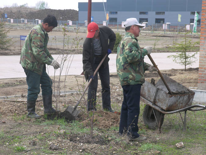 圖片新聞:虎林北大荒米業(yè)廠區(qū)環(huán)境特殊,離鐵路沿線只有50米,垃圾較多,為創(chuàng)造良好的廠區(qū)環(huán)境,他們組織各科室人員對廠區(qū)院內(nèi)垃圾死角進行全面清理,清理白色垃圾、清掃枯葉垃圾,美化廠區(qū)環(huán)境。利用閑置空地植栽樹木,目前已有丁香花100余株,果樹500余株。 圖為員工們正在栽植樹木。