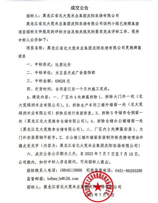 黑龍江省北大荒米業(yè)集團(tuán)慶陽農(nóng)場有限公司更換牌匾項(xiàng)目成交公告