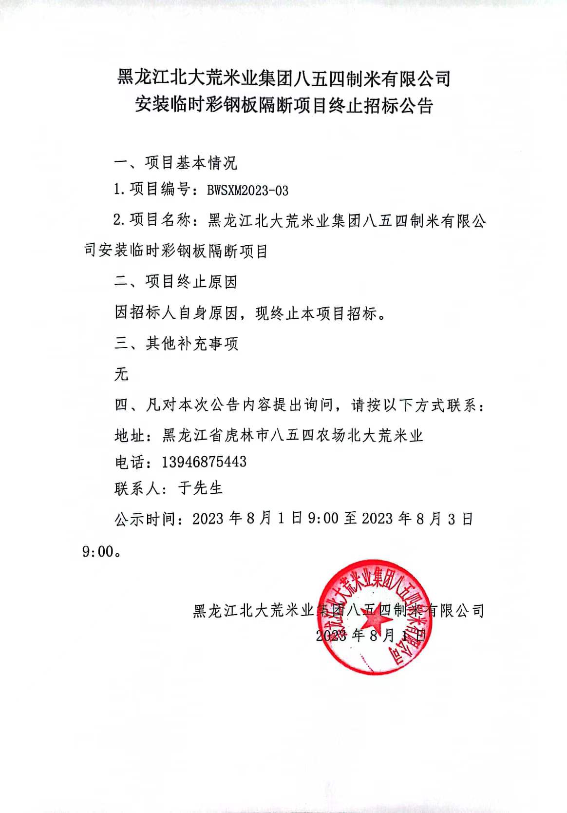 黑龍江北大荒米業(yè)集團八五四制米有限公司安裝臨時彩鋼板隔斷項目終止招標(biāo)公告