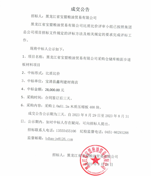 黑龍江省寶盟糧油貿(mào)易有限公司采購(gòu)倉(cāng)儲(chǔ)庫(kù)內(nèi)糧面步道板材項(xiàng)目中標(biāo)公告