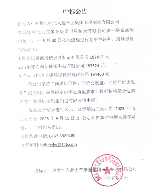 黑龍江省北大荒米業(yè)集團(tuán)衛(wèi)星制米有限公司烘干塔布袋除塵項(xiàng)目中標(biāo)公告
