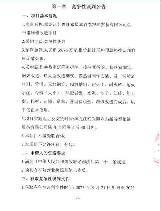 黑龍江紅興隆農(nóng)墾鑫谷泰糧油貿(mào)易有限公司烘干塔維修改造項(xiàng)目競(jìng)爭(zhēng)性談判公告