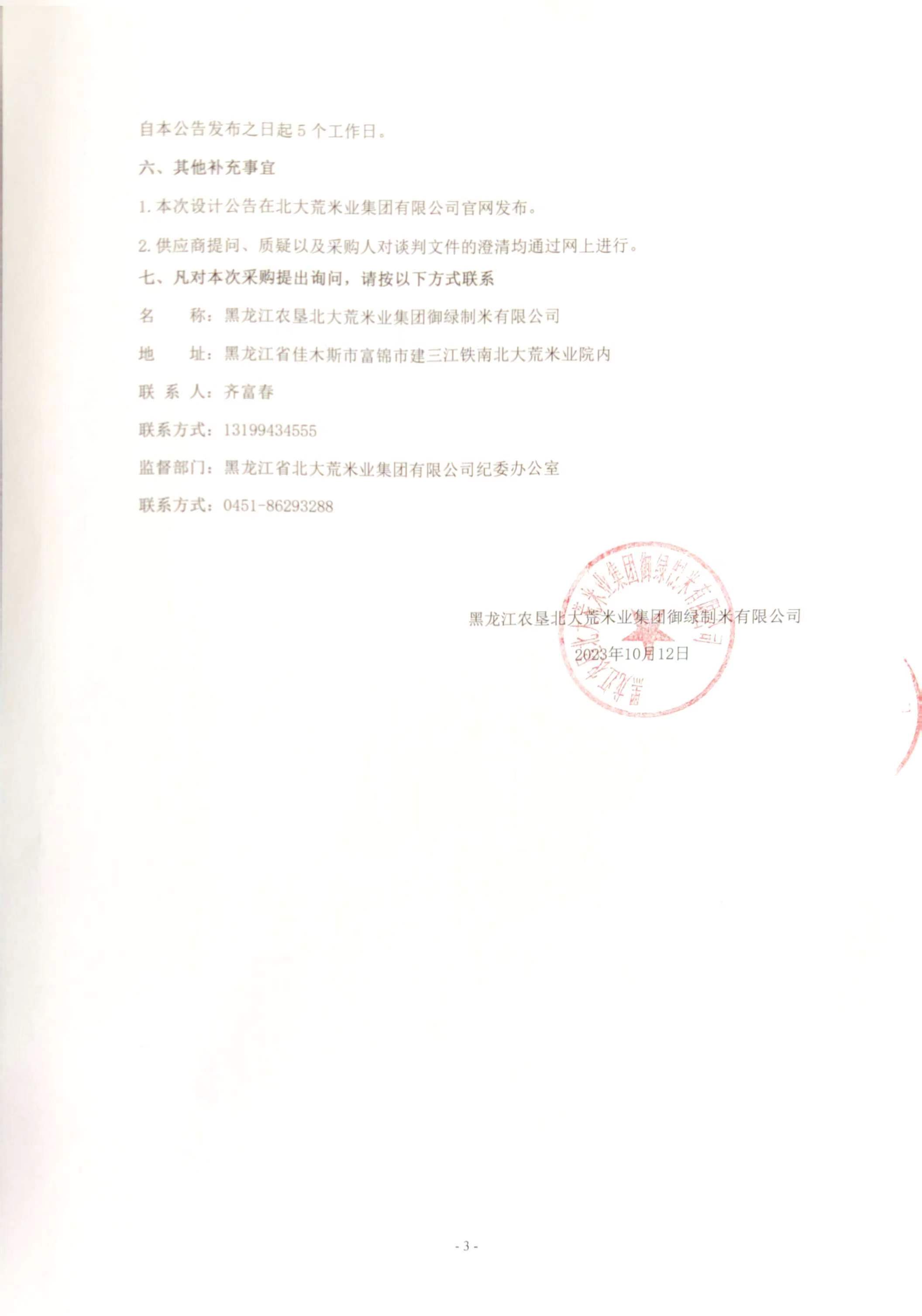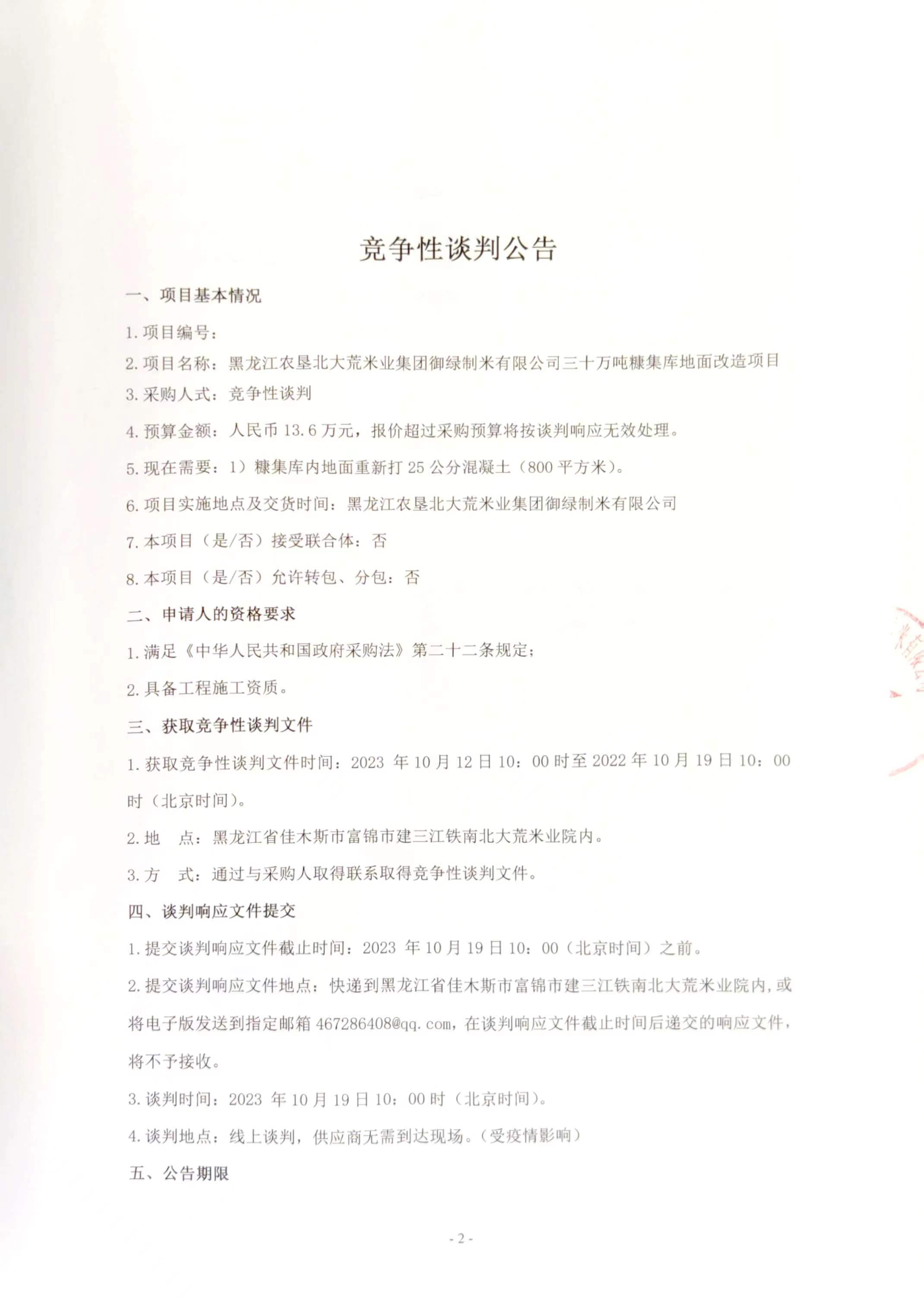 黑龍江農(nóng)墾北大荒集團御綠制米有限公司三十萬噸糠集庫地面改造項目競爭性談判公告