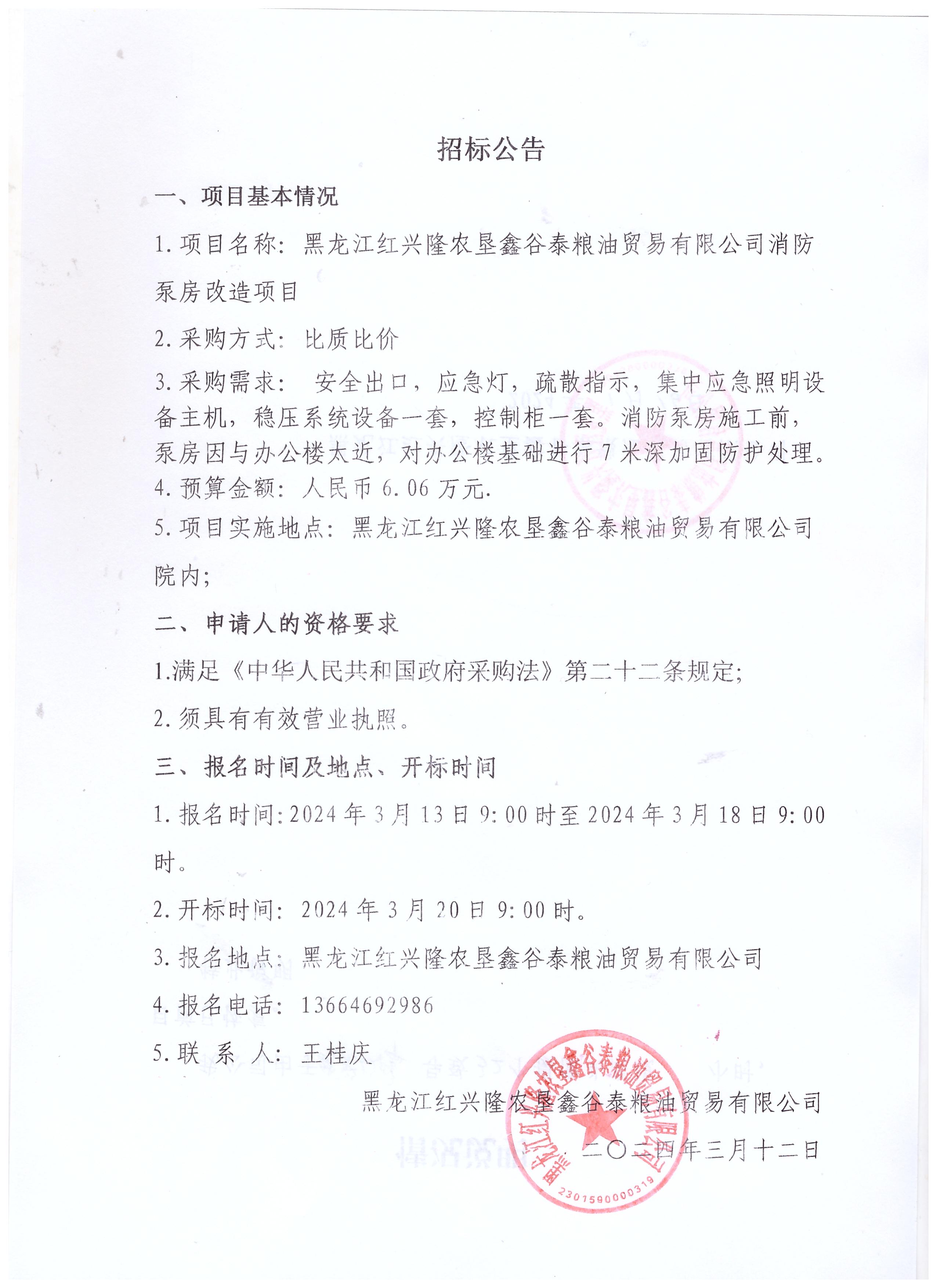 黑龍江紅興隆農(nóng)墾鑫谷泰糧油貿(mào)易有限公司消防泵房改造項(xiàng)目招標(biāo)公告