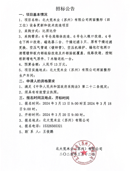 北大荒米業(yè)(蘇州)有限公司兩面整形(四工位)設備更新和技術改造項目招標公告
