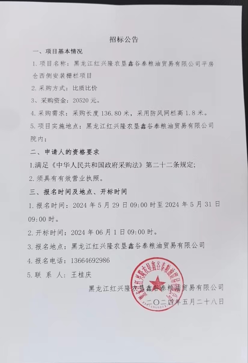 黑龍江紅興隆農(nóng)墾鑫谷泰糧油貿(mào)易有限公司平房倉西側(cè)安裝欄柵項(xiàng)目招標(biāo)公告