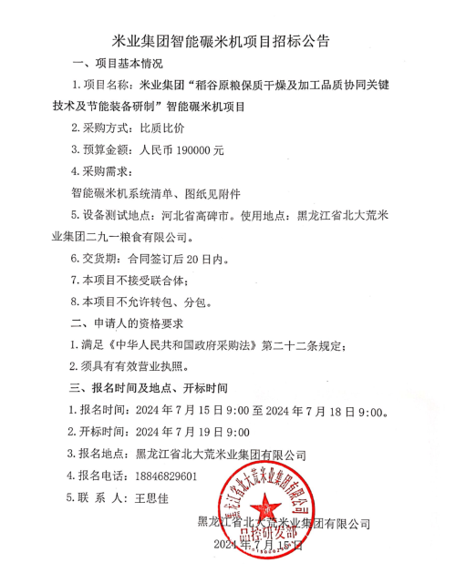 米業(yè)集團(tuán)“稻谷原糧保質(zhì)干燥及加工品質(zhì)協(xié)同關(guān)鍵技術(shù)及節(jié)能裝備研制”智能碾米機(jī)項(xiàng)目招標(biāo)公告