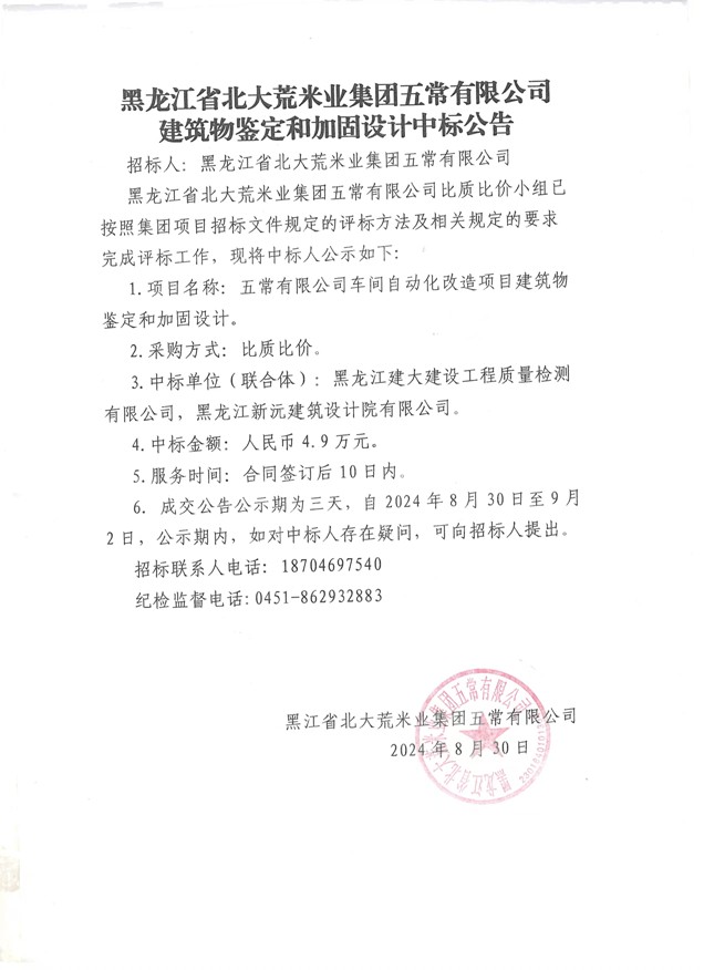 北大荒米業(yè)五常公司建筑物鑒定和加固設(shè)計中標(biāo)公告