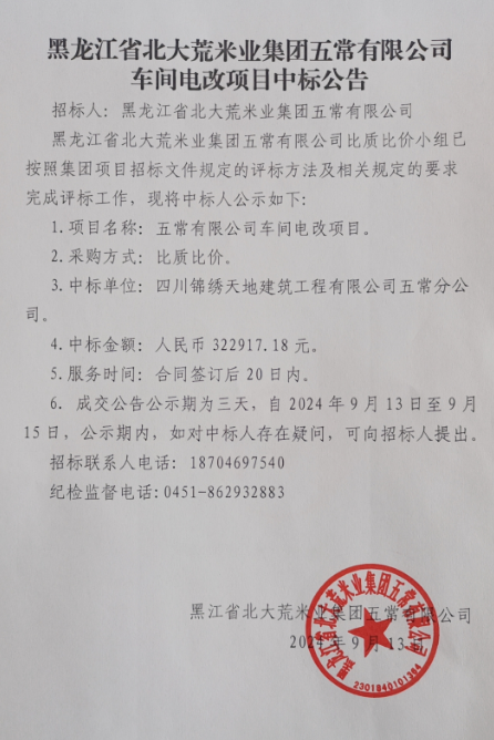 黑龍江省北大荒米業(yè)集團五常有限公司車間電改項目中標公告