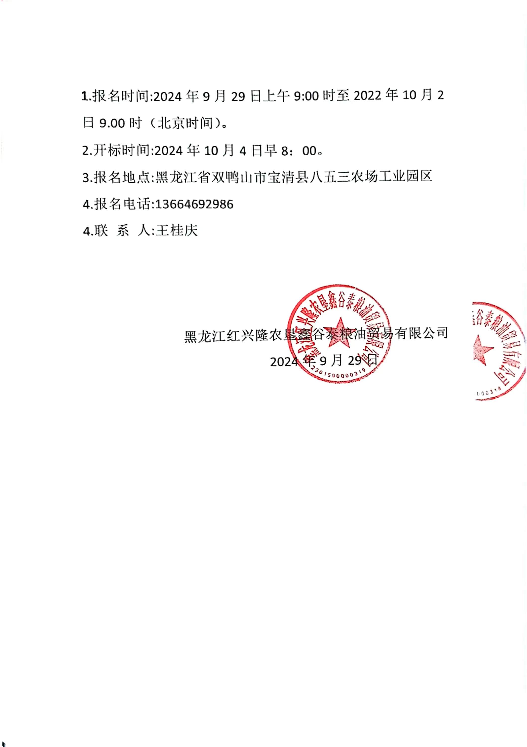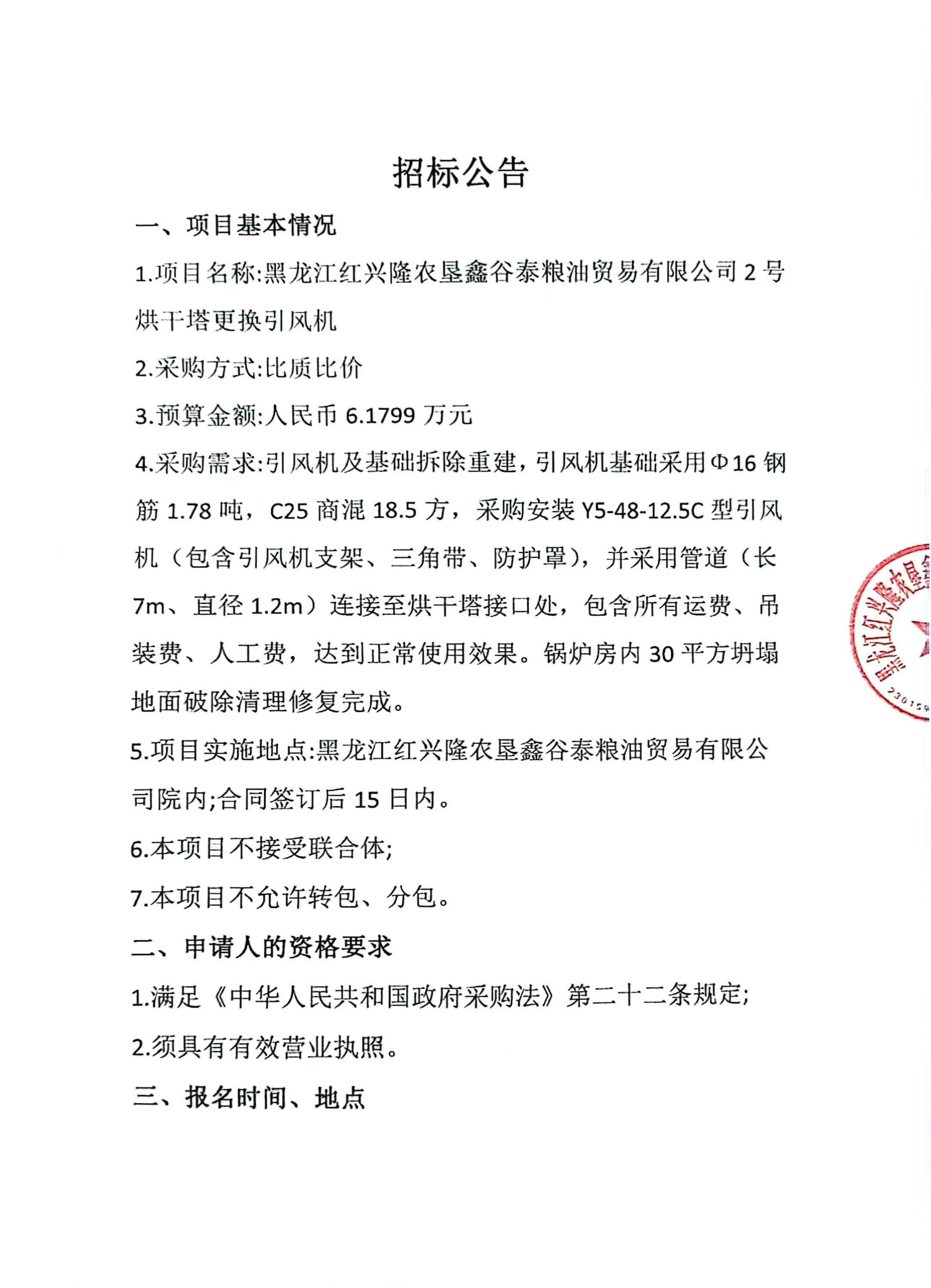 黑龍江紅興隆農(nóng)墾鑫谷泰糧油貿(mào)易有限公司2號烘干塔更換引風(fēng)機(jī)招標(biāo)公告