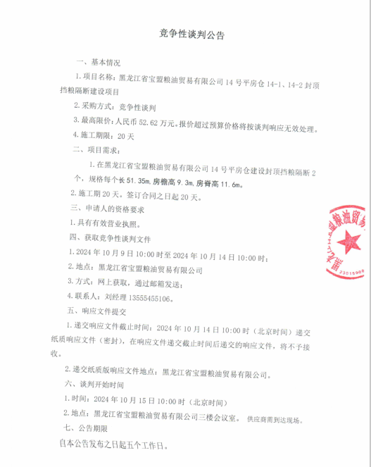 黑龍江省寶盟糧油貿(mào)易有限公司14號平房倉擋糧隔斷項(xiàng)目競爭性談判公告