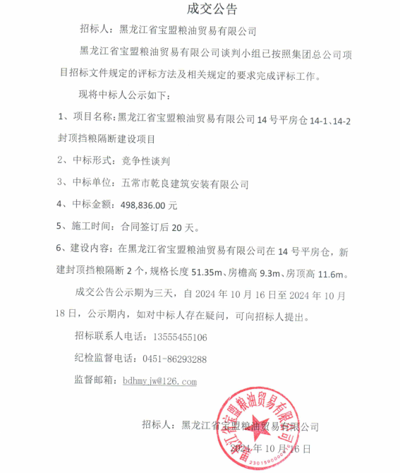 寶盟糧油貿(mào)易有限公司擋糧隔斷建設(shè)項目中標公告