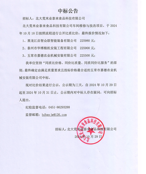 泰來科技有限公司車間維修與技改項目中標(biāo)公告