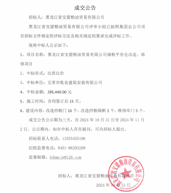 黑龍江省寶盟糧油貿(mào)易有限公司平房倉(cāng)改造維修項(xiàng)目中標(biāo)公告