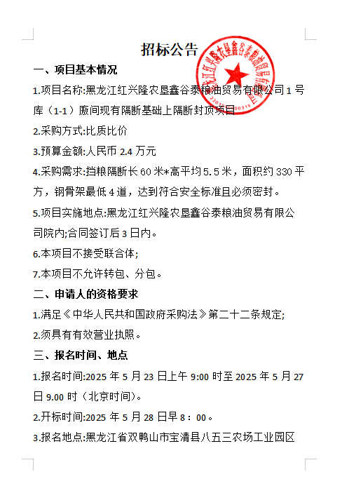 黑龍江紅興隆農(nóng)墾鑫谷泰糧油貿(mào)易有限公司隔斷封頂項(xiàng)目