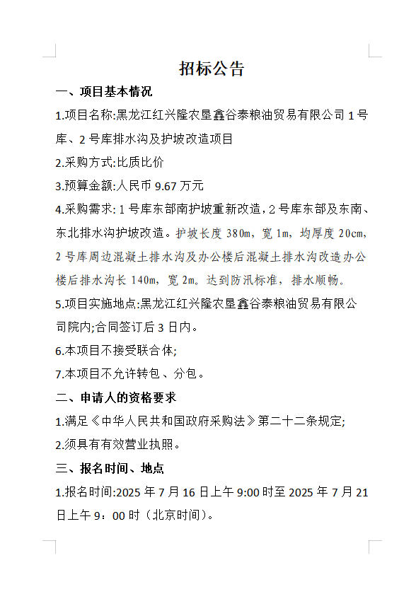 黑龍江紅興隆農(nóng)墾鑫谷泰公司國儲糧1號、2號排水溝及護坡改造項目招標公告