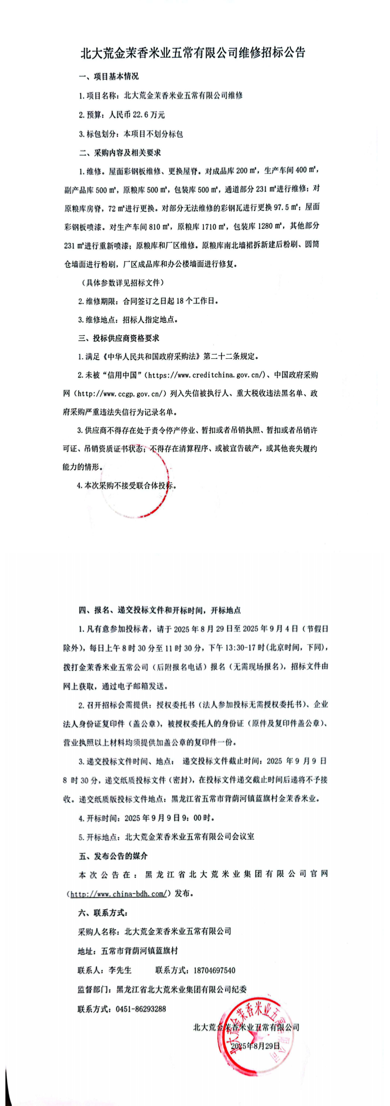 北大荒金茉香米業(yè)五常有限公司維修招標公告