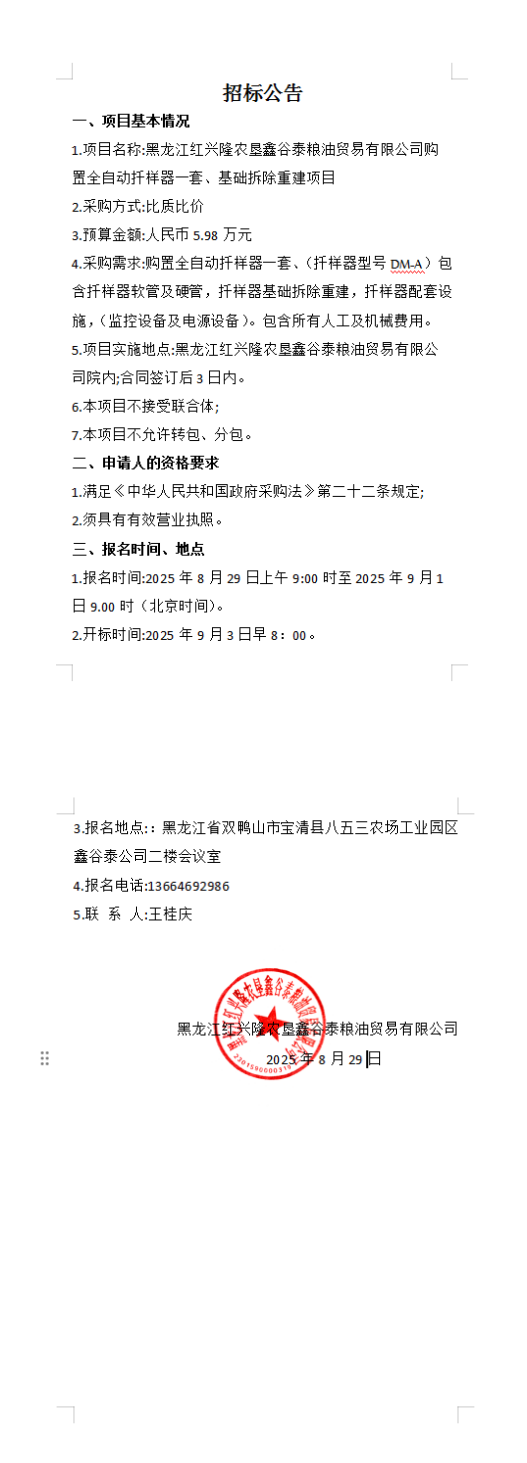 黑龍江紅興隆農(nóng)墾鑫谷泰糧油貿(mào)易有限公司購(gòu)置全自動(dòng)扦樣器一套、基礎(chǔ)拆除重建項(xiàng)目