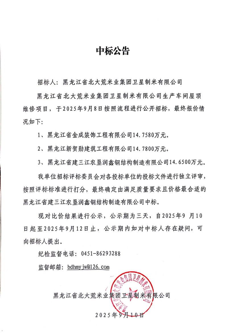 衛(wèi)星制米有限公司生產(chǎn)車間屋頂維修項(xiàng)目中標(biāo)公告