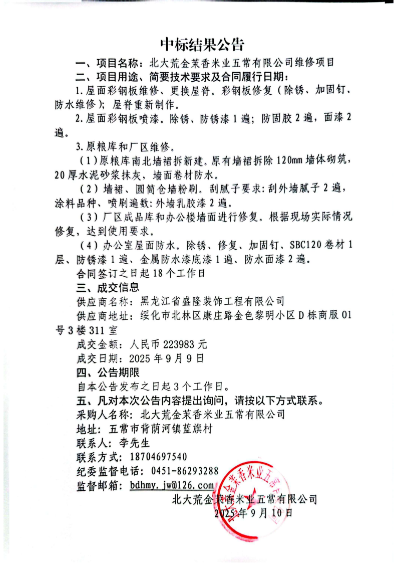 北大荒金茉香米業(yè)五常有限公司維修項(xiàng)目中標(biāo)公告