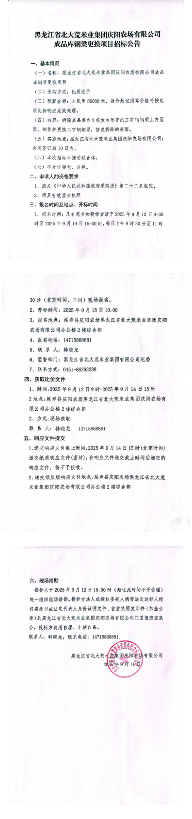 黑龍江省北大荒米業(yè)集團慶陽農(nóng)場有限公司成品庫鋼梁更換項目招標公告