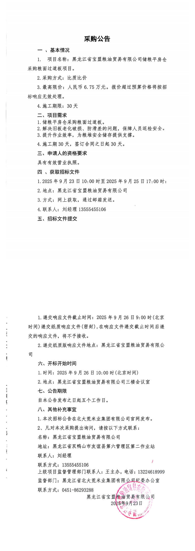 黑龍江省寶盟糧油貿(mào)易有限公司儲糧平房倉采購糧面過道板項目招標(biāo)公告