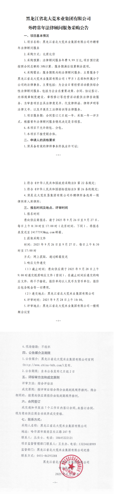 黑龍江省北大荒米業(yè)集團(tuán)有限公司外聘常年法律顧問服務(wù)采購公告