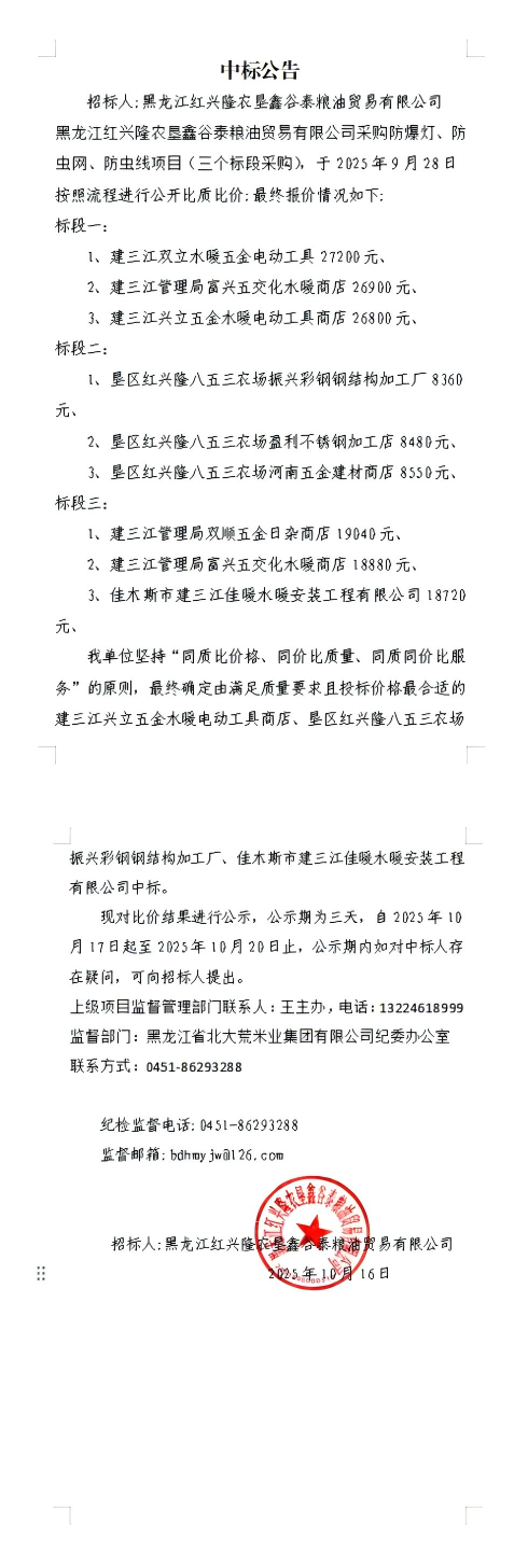 鑫谷泰糧油貿(mào)易有限公司采購防爆燈、防蟲網(wǎng)、防蟲線項目(三個標(biāo)段采購)成交公告