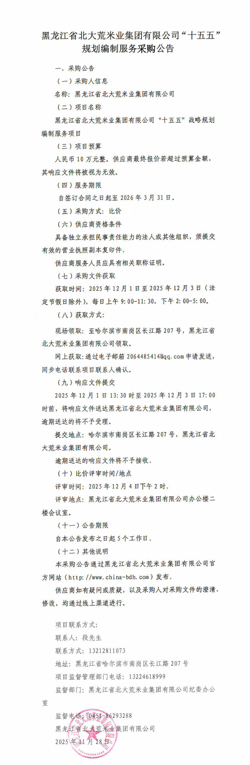 黑龍江省北大荒米業(yè)集團有限公司“十五五”規(guī)劃編制服務采購公告