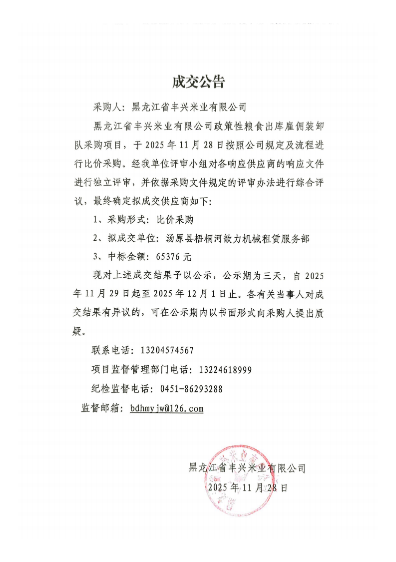 豐興米業(yè)政策性糧食出庫雇傭裝卸隊成交公告
