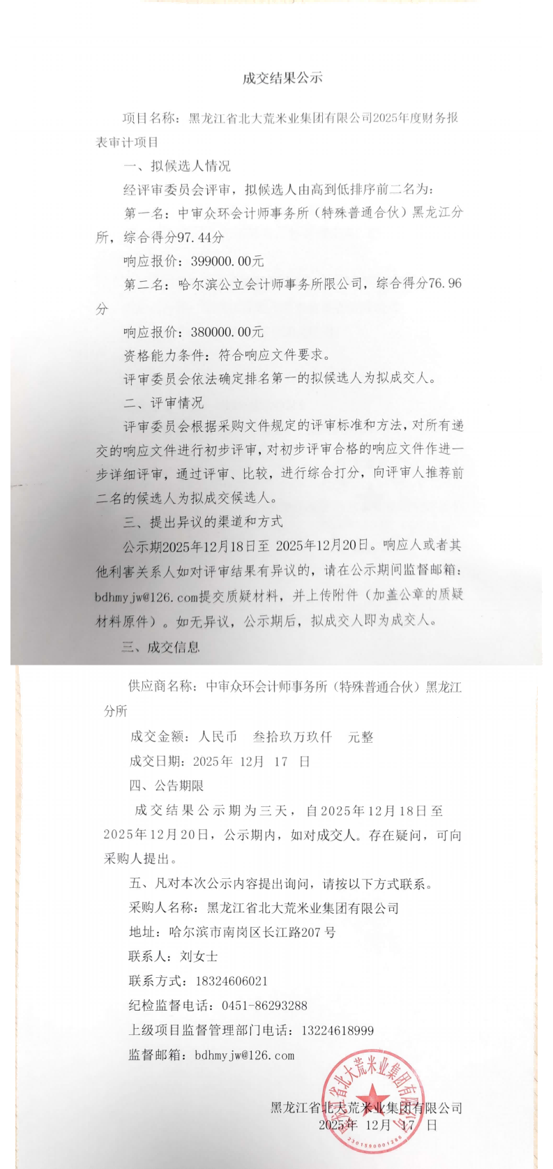 北大荒米業(yè)集團有限公司2025年度財務(wù)報表審計項目成交公告